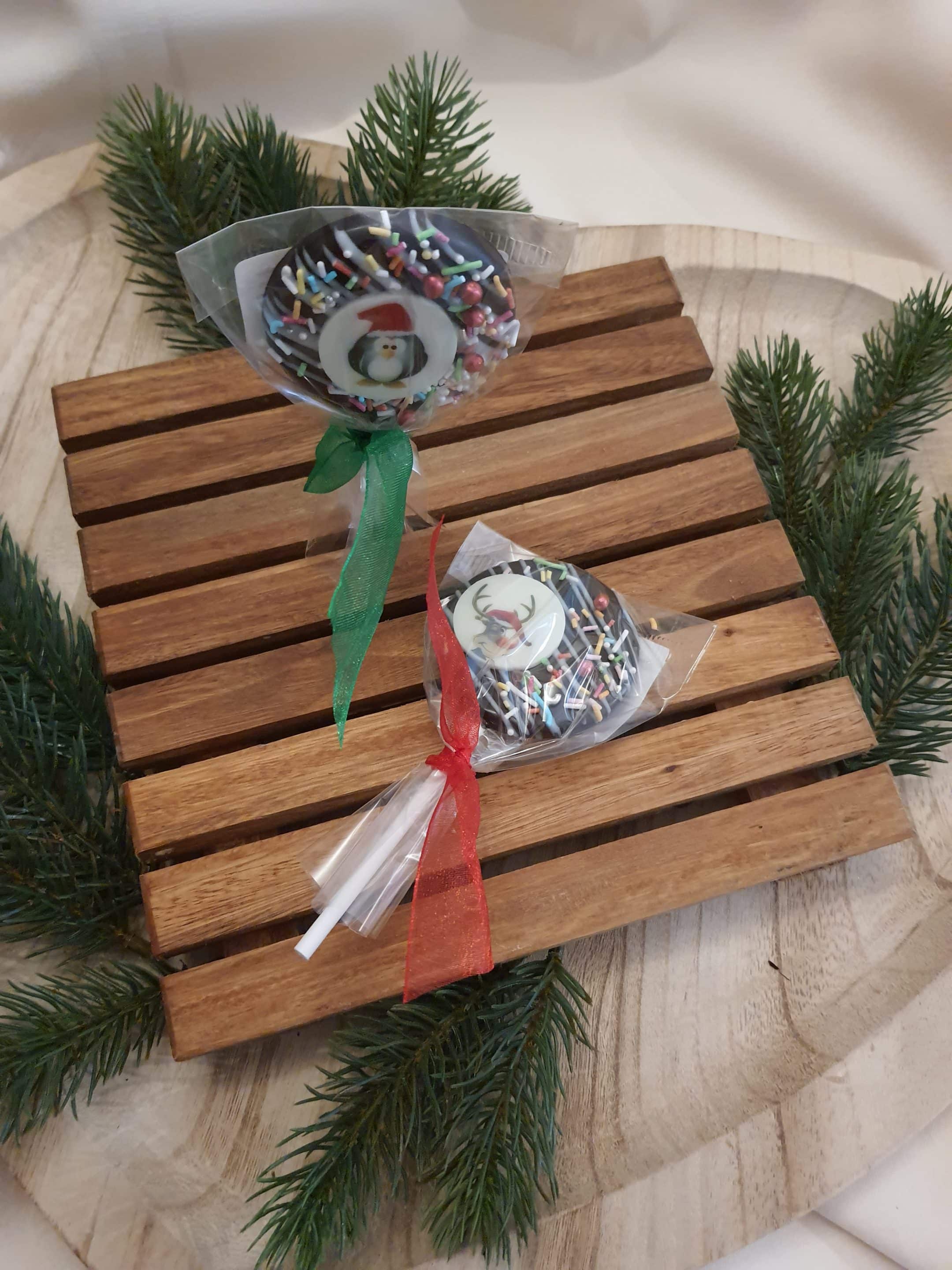 Feinste Kreation Lolli Zartbitterschokolade 70 % Kakaoanteil mit bunten Streuseln und Weihnachtsmotiv
