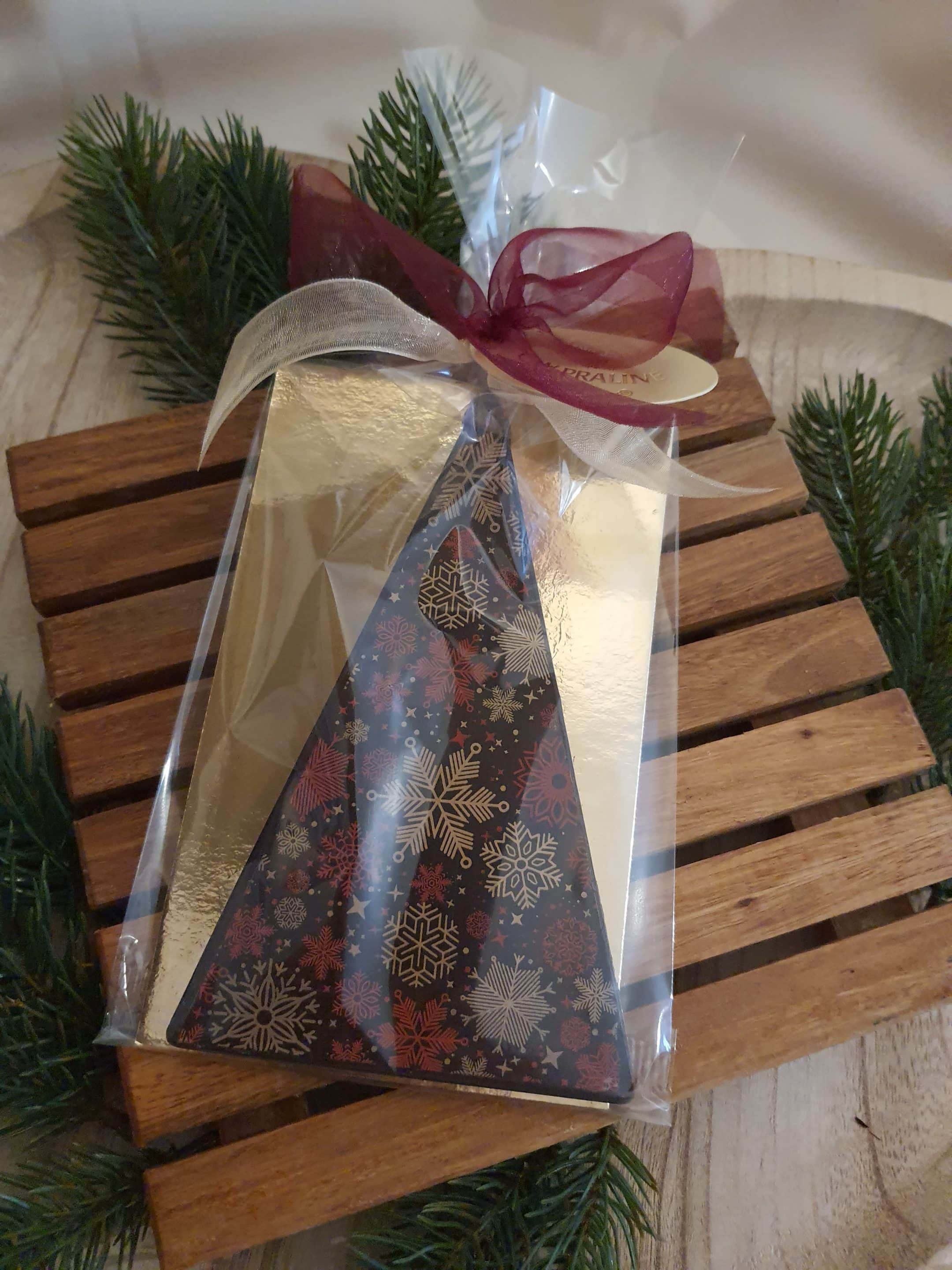 Leckere Zartbitterschokolade Tannenbaumform , bedruckt mit einem Weihnachtlichen Motiv. Ein schönes Geschenk für die Weihnachtszeit.