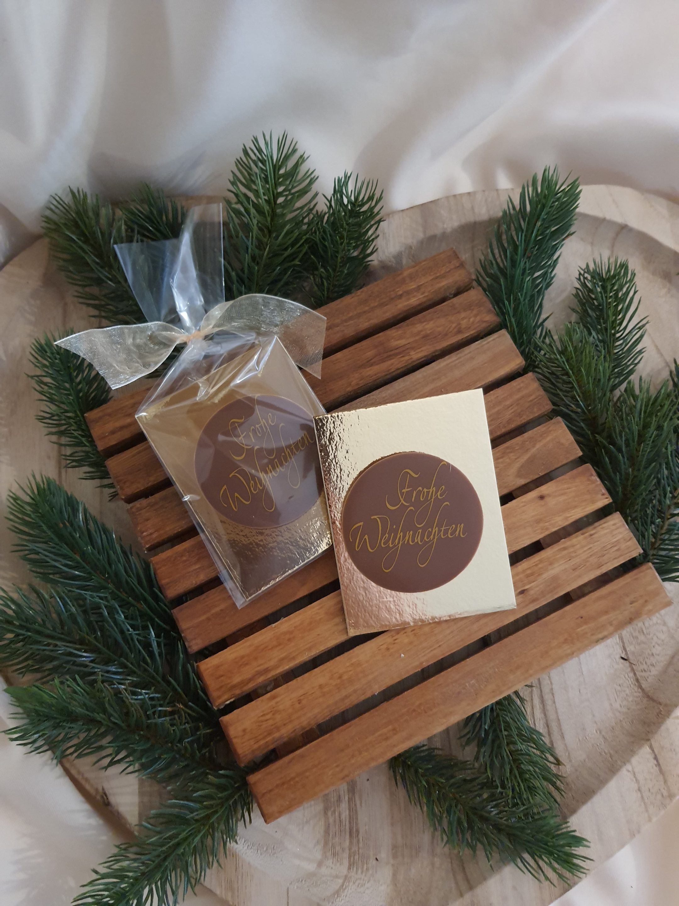 Vollmilchtaler 34% Kakaoanteil mit Aufschrift Frohe Weihnachten. Ideal zum Verschenken, oder selber vernaschen.